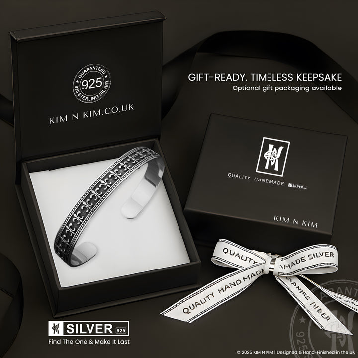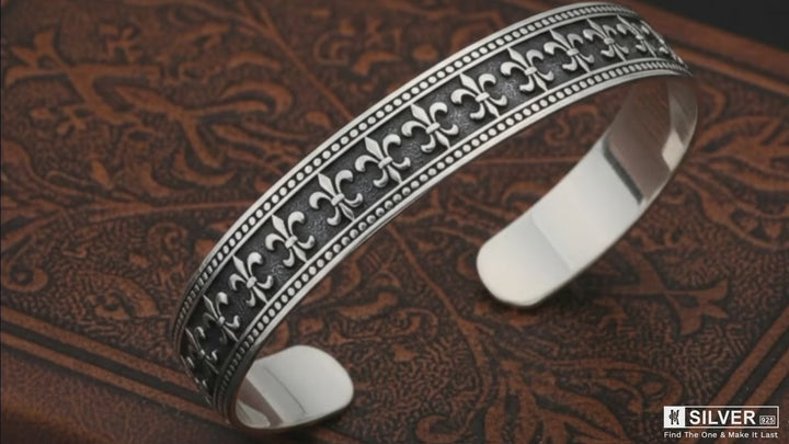 ✨Handmade 925 sterling-silver men’s cuff with classic Fleur-de-Lis pattern, adjustable and gift-ready.✨
