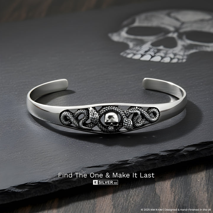 Hallmarked 925 Silver Skull & Serpent Cuff Bangle