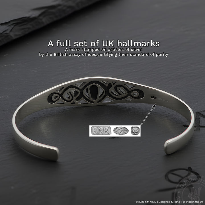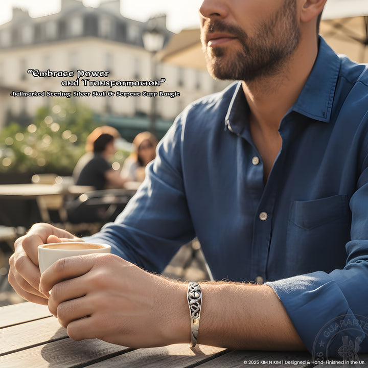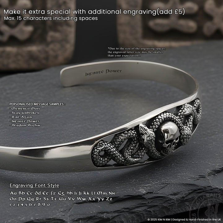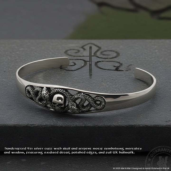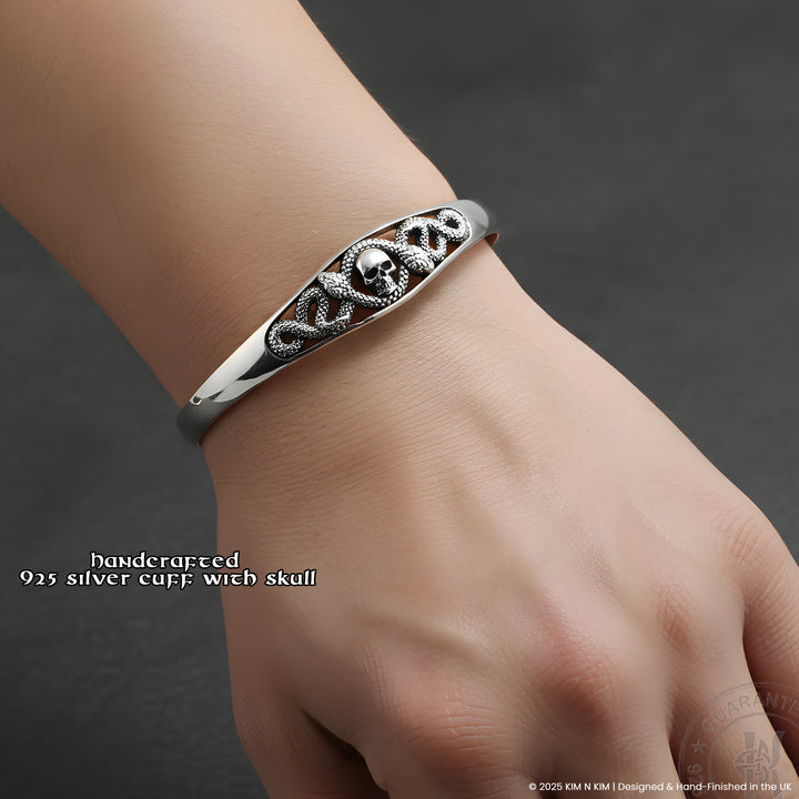 ✨Handcrafted hallmarked 925 silver cuff featuring skull and serpent motif – a symbol of power and wisdom. Optional engraving and gift box available.✨