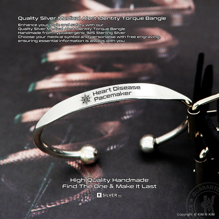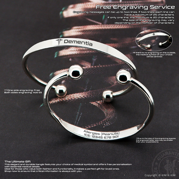šEnhance your style and safety with our Hypoallergenic Medical Alert Bangle, handmade from solid 925 Sterling Silver. This elegant and durable bangle features your choice of medical symbol and offers free personalisation with critical medical details. Ideal for those who value both fashion and functionality, itās a perfect gift for loved ones. Shop now and ensure essential information is always with you.š