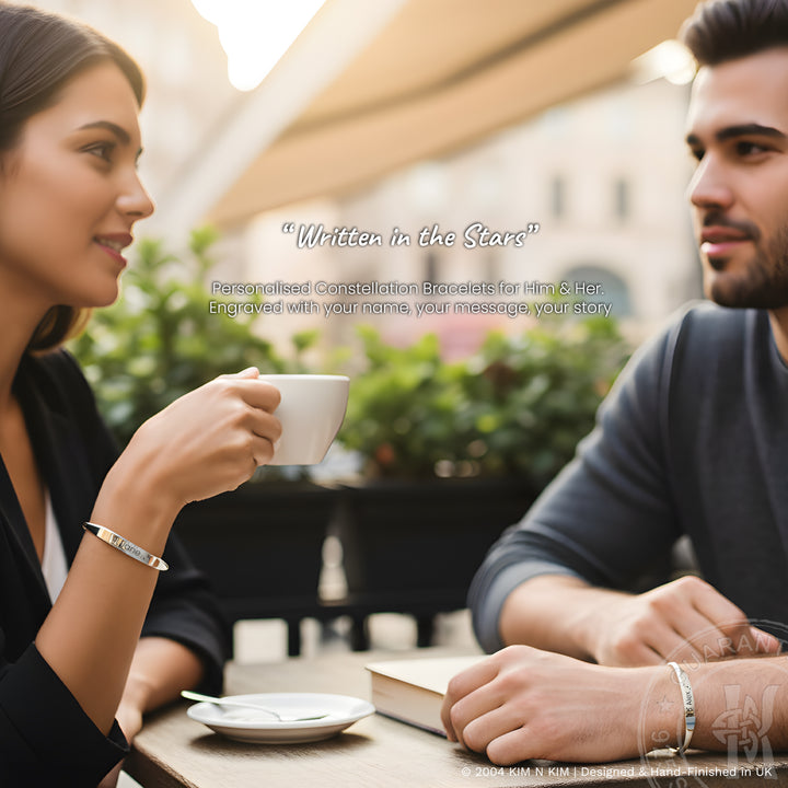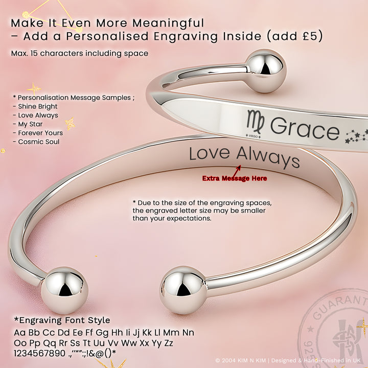 ✨Celebrate the stars with this personalised 925 Sterling Silver Zodiac Cuff Bangle. Choose from 12 star sign designs, personalise with your name on the outside, and add a special engraved message on the inside. A meaningful astrology-inspired jewellery gift for women.✨
